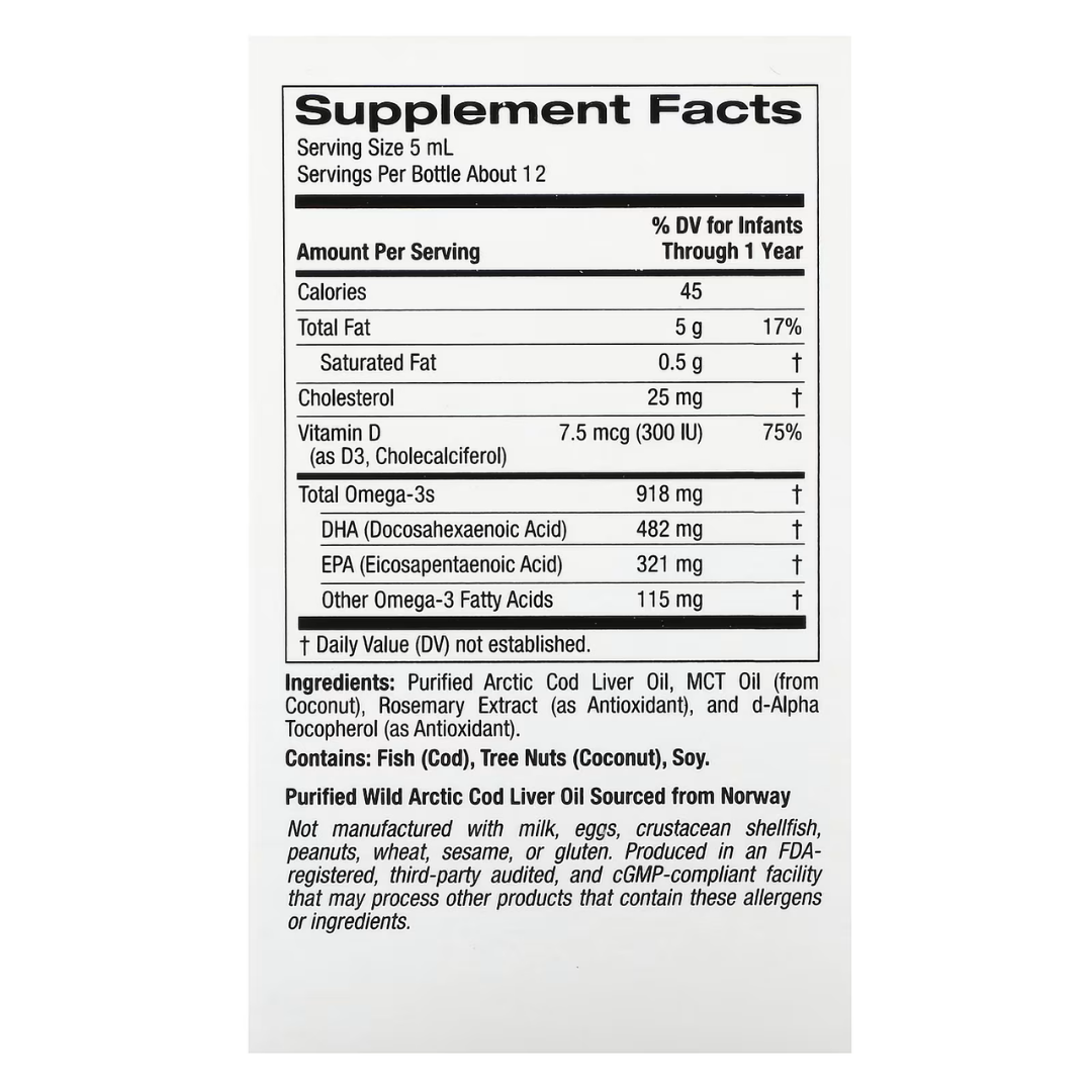 Жидкая ДГК для детей от California Gold Nutrition BABY содержит омега-3 ДГК и ЭПК, полученные исключительно из жира печени дикой норвежской трески в предпочтительной форме триглицеридов. Каждая партия тестируется на наличие потенциально опасных уровней загрязняющих веществ (например, таких тяжёлых металлов, как ртуть) и превосходит требования самых строгих международных стандартов чистоты и свежести.