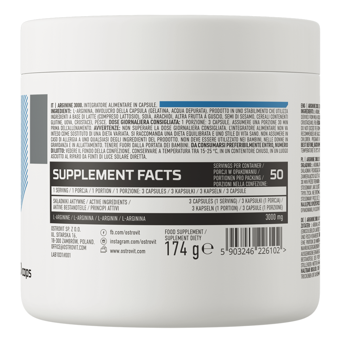 OstroVit Аргинин -это высококачественная пищевая добавка, которая является ценным источником аминокислоты L-аргинина. Она доступна в форме легко глотаемых капсул, предназначенных для спортсменов и людей, которые хотят дополнить свой рацион ценным соединением.