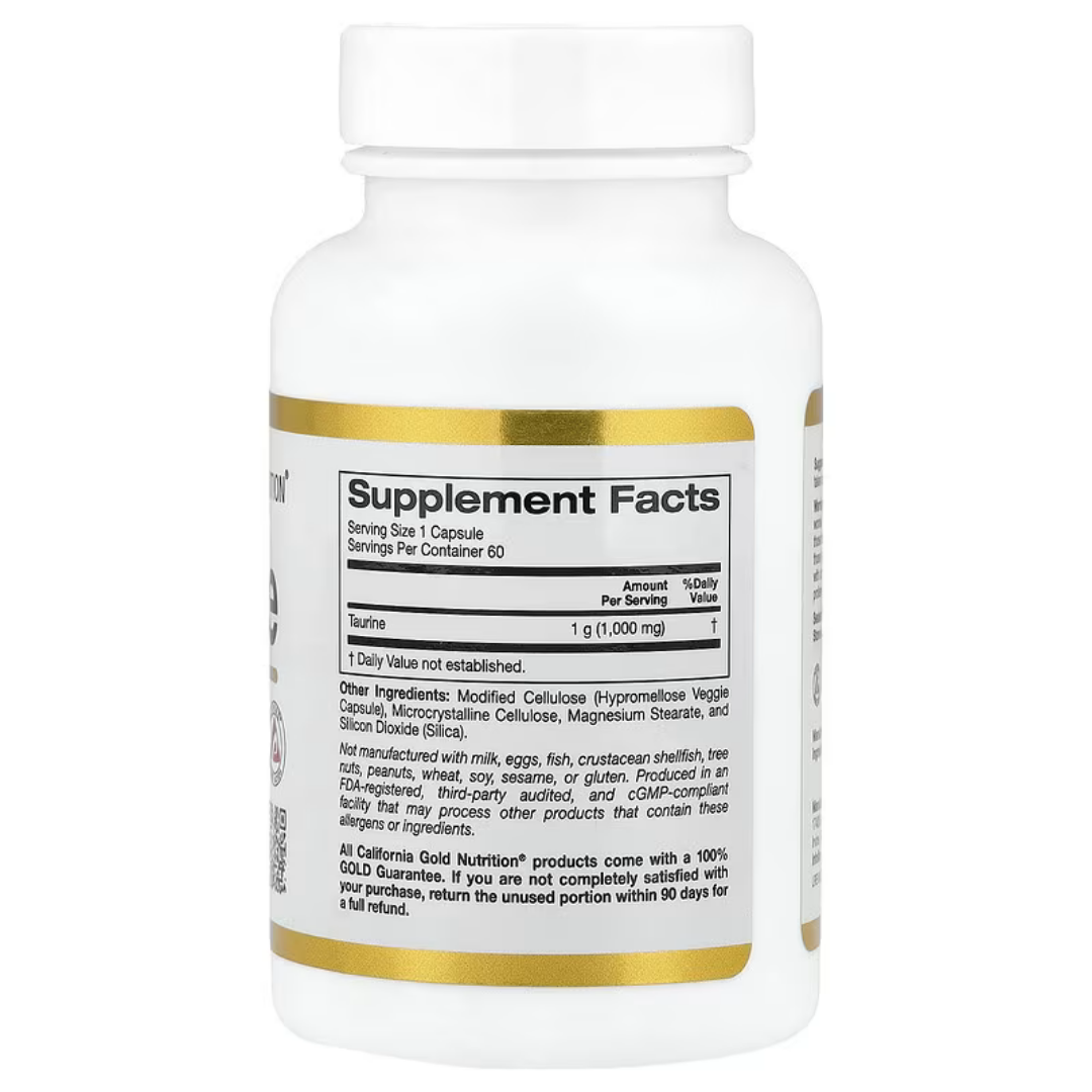 Таурин от California Gold Nutrition® содержит таурин AjiPure® фармацевтической степени чистоты в растительных капсулах.