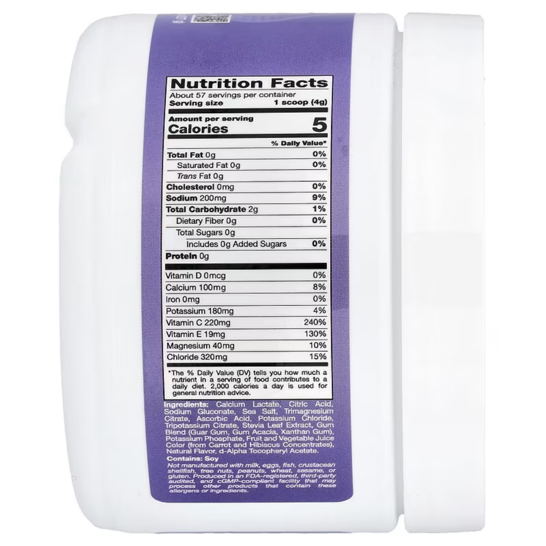 Лактат кальция, лимонная кислота, глюконат натрия, морская соль, цитрат тримагния, аскорбиновая кислота, хлорид калия, цитрат калия 3-замещенный, экстракт листьев стевии, смесь камеди (гуаровая камедь, аравийская камедь, ксантановая камедь), фосфат калия, фруктовый и овощной сок (краситель) (из концентратов моркови и гибискуса), натуральный ароматизатор, d-альфа токоферилацетат. Содержит сою. При производстве не используется молоко, яйца, рыба, моллюсков и ракообразных, древесные орехи, арахис, пшеница, кунжут, глютен. Произведено на предприятии, имеющем регистрацию Управления по контролю качества пищевых продуктов и лекарственных средств США, которое проходит независимые проверки, имеет регистрацию текущей надлежащей производственной практики (cGMP), и где также могут обрабатываться другие продукты, содержащие эти аллергены или ингредиенты.
